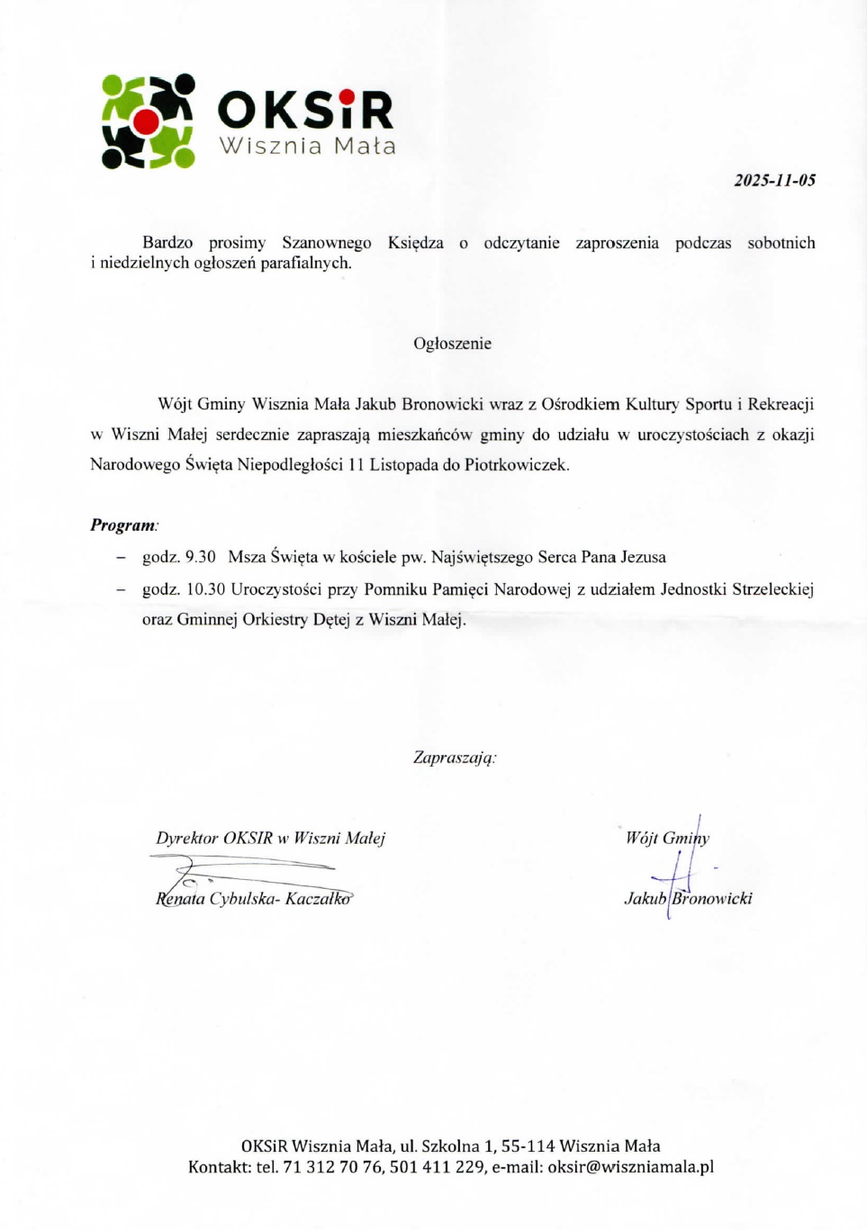 4. Pan Wójt Gminy Wisznia Mała zaprasza na obchody Święta Niepodległości do Piotrkowiczek. Informacje w gablocie i na stronie internetowej.